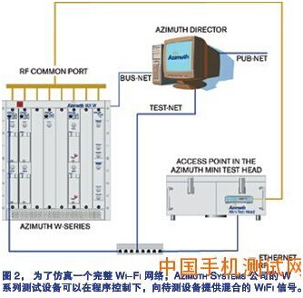 但各家公司的测试方法也不尽相同。Azimuth 公司的 W 系列测试平台为 DUT 提供了一个屏蔽罩,通过一个电缆系统反馈受控信号(图 2)。测试信号来自一组发生器模块,一台计算机控制着这组模块,规定每个模块的功能,协调信号的活动,并且用可编程衰减器管理射频输出的组合。这样,系统能够在可重复配置环境下模仿多种传输图形和信号条件,包括漫游状态,而无需屏蔽室。