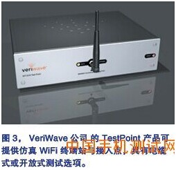 Ixia公司 的 IxWLAN 与 VeriWave公司 的 WaveTest 系统则允许使用电缆方法和开放方法(图 3)。系统可以同步控制多个测试激励设备产生的网络信号,同时控制测试激励设备的发射功率和接收阈值。系统可以用于法拉第笼的电缆配置方式,或者用于开放场的环境。VeriWave 系统还能够捕捉场中的信号,供以后在实验室条件下回放。