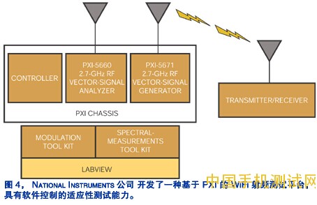 Instruments公司 正在自己的射频测试系统中采用可编程方案(图 4),该公司的模块化仪器产品经理 Darcy Dement 称:“技术发展了,测试也必须跟着发展。当设备采用软件驱动时,设计者可以使自己的工具跟上标准的变化。通过使用 LabView 这样的开放结构,设计者还能介入测试参数,从而针对自己的特殊需求进行定制。”Azimuth公司 的 Cronin 也同意可编程性是测试跟上标准变化的关键。他说:“如果我们的工具里没有可编程能力,标准的变化就会成为开发人员创立自己的特定工具的负担。”