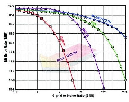 由上图可见,ZigBee的误码率在信噪比为4dB的情况下可达10 -9 ,要达到同样误码率,Wi-Fi要达 10dB,蓝牙高达16dB, ZIGBEE的抗干扰性能明显高于Wi-Fi和蓝牙技术。